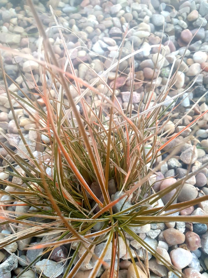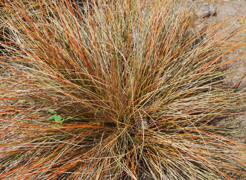 - Liście: bardzo wąskie (1–3 mm), delikatne; w sezonie zielone z pomarańczowymi końcówkami, od późnego lata stopniowo przebarwiają się na pomarańczowo–miedziane; w dużej mierze zimozielone, szczególnie w łagodniejsze zimy; intensywność barw rośnie w pełnym słońcu.